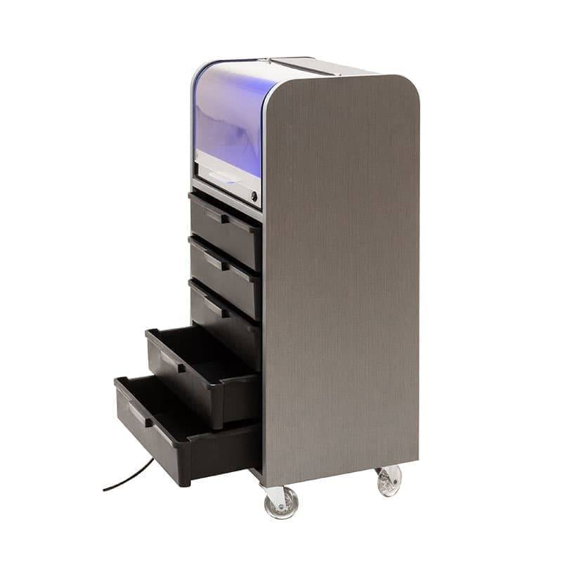 Eszközkocsi SCRIGNO UV pult sterilizátorhoz, amely Maletti termékcsaláddal laminált anyagaival testreszabható. Kocsi komplett gyors kerekekkel. 5 FEKETE színes fiók. A „Giovannoni Design” innovatív dizájnja – A SCRIGNO STERILIZÁLÓ KIZÁRVA.