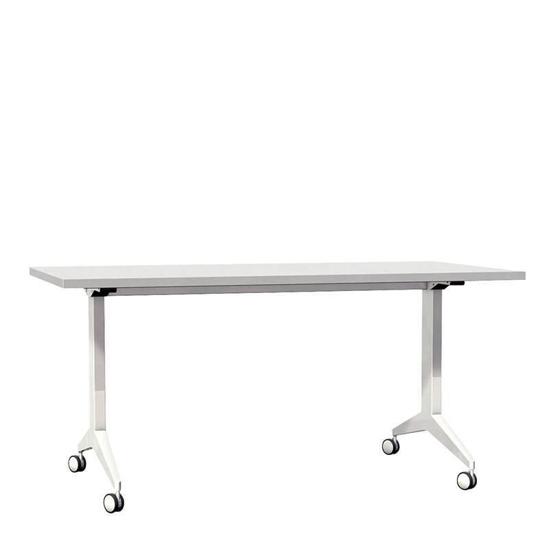 Munkaállomás összecsukható tetővel. Fehérre festett fémkeret forgó görgőkkel. Festett rétegelt lemez összecsukható tetővel. Világos tölgy vagy fehér színű felső.