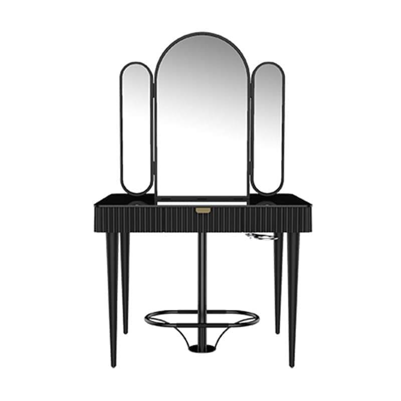 Merev poliuretánból készült szerkezet, matt feketére lakkozva, bordázott díszítéssel. 2 fa felületű tükör. Állítható pozíciójú oldalsó tükrök. 10 mm vastag felső polc, tetején biztonsági tiszta fekete fóliával. Konzolos lábak lakkozott fekete színű tömör fából. Összecsukható hajszárítótartó, feketére festve. Dupla elektromos aljzat. Porszórtan festett lábtartó.
