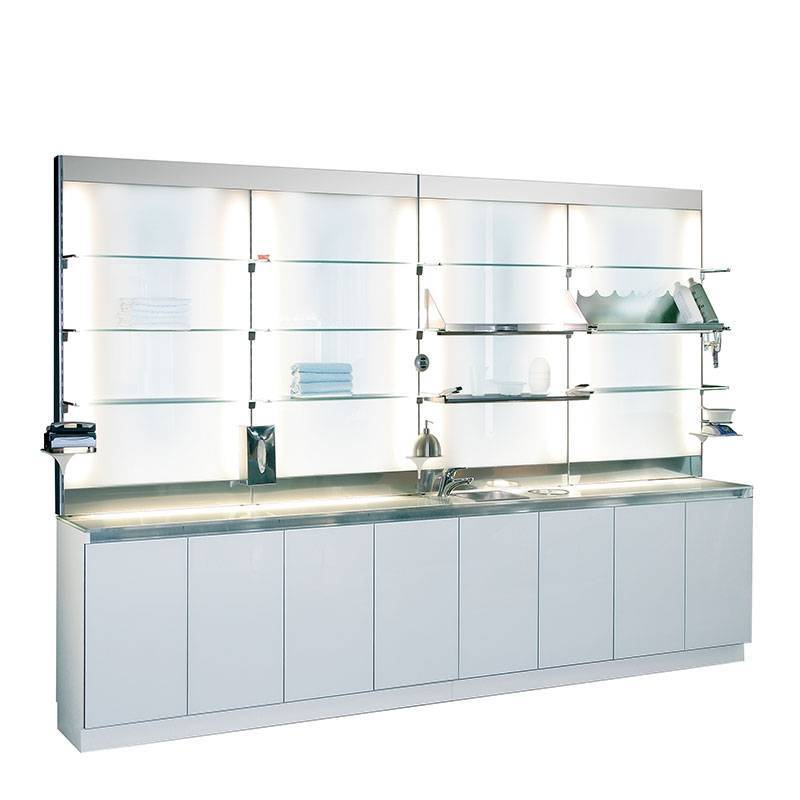 A háttérvilágítással rendelkező felső szekrény üvegszerkezete, alumínium keretben, extra fehér polcokkal.