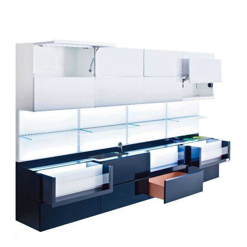 Moduláris színező állomás. Csiszolt fehér felülettel és alumínium kerettel. Edzett szitanyomású üvegajtó és polc. Alsó rész fiókokkal.