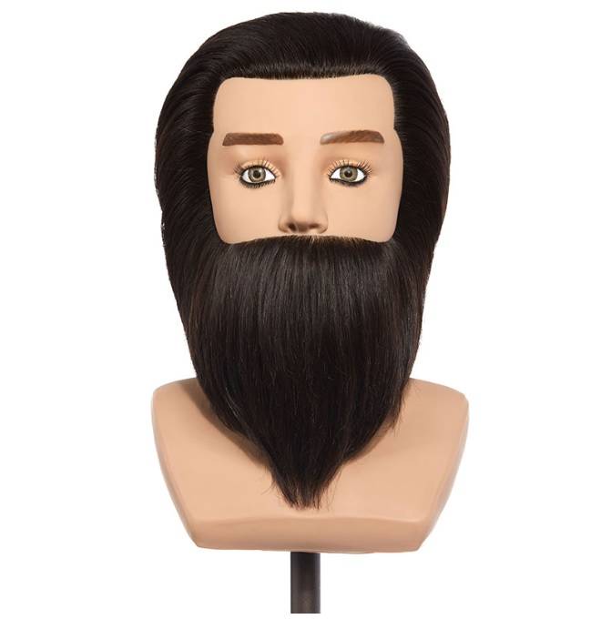 Szemléltető babafej. Fiú. Szakállas. 100% emberi haj. Sötét barna. Vállas. Verseny szemléltetőfej.