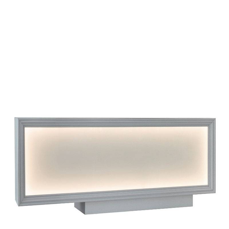 Halványszürke vízálló melamin keret és kiálló rész. Alumínium elülső keret fehér szitanyomáson nyomtatott fényáteresztő üveggel. Belső LED csíkokkal. Edzett szitanyomáson nyomtatott extra átlátszó üveglap. L. 300 cm
