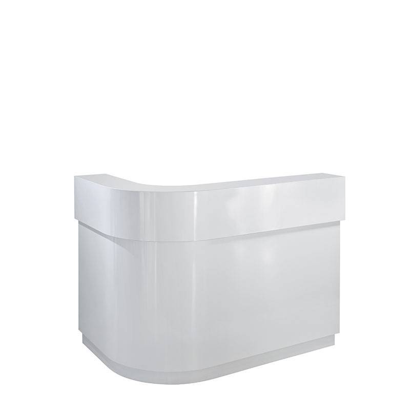 Recepciós pult. Belső vízálló felszínű keret, ívelt polírozott, fehér laminált felülettel. Zárható fiókkal, billentyűzettartóval és nyitott számítógépes rekesszel.
