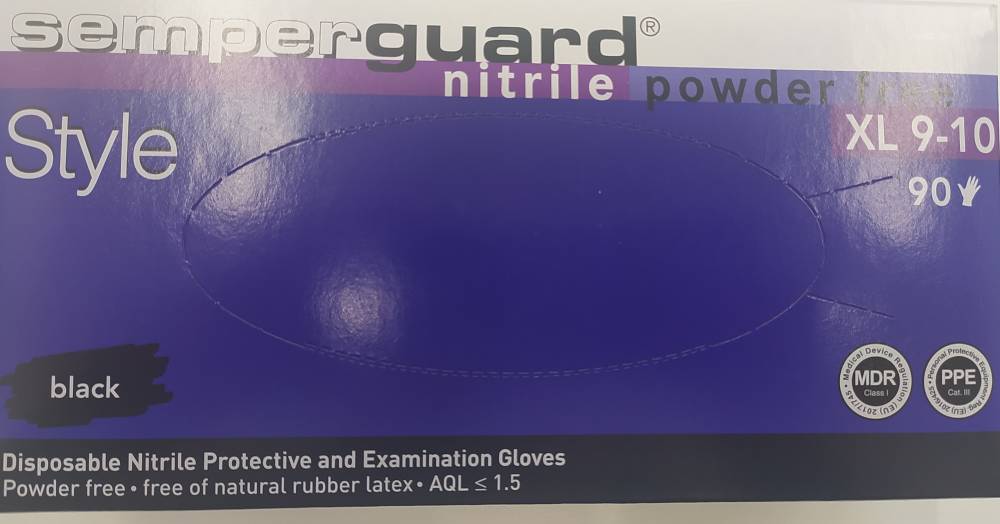 Prémium minőség. Kesztyű. Nitril. Fekete. Púdermentes. 90 db-os. A divatos fekete szín a kifinomultság és a profizmus érzetét kelti. Biztonságos fogás és magas viselési kényelem kombinálva, köszönhetően az ujjak felületének és a rugalmas nitril anyagnak. A kettős jelölés megfelel azoknak a szakmai területeknek az orvosi követelményeinek, ahol nemcsak személyes védelemre van szükség.