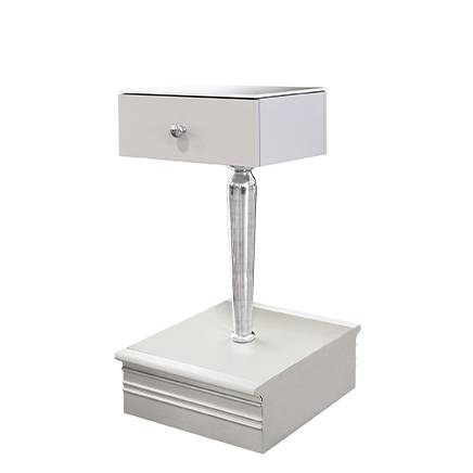 Drawer unit, frame in light grey waterproof melamine RAL 7047, support leg in polished cast aluminium , top in coated screen printed glass. Integrated plinth.