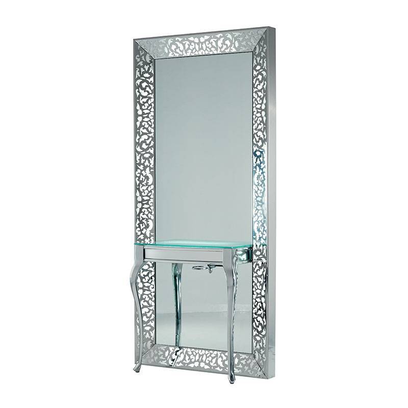 Falra szerelhető tükrös munka asztal. 14080 I. Louis Csiszolt alumínium keret és támasztólábak, selyem szitanyomású, edzett extra átlátszó üveg tető. Beépített kihúzható hajszárító tartó. Belső keretfény. Rozsdamentes acél tükörkeret és LED háttérvilágítású opál plexi. Tükör metszet nélkül.