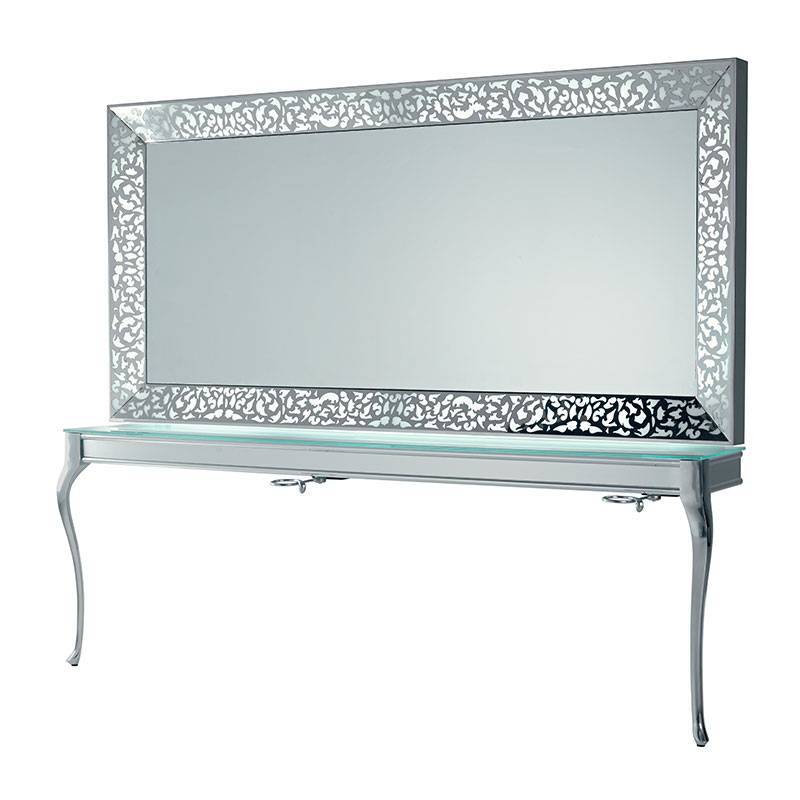 Kétüléses falra szerelhető fodrász munkahely . 14110 Louise 2. Csiszolt alumínium keret és támasztólábak, selyem szitanyomású, edzett extra átlátszó üveg tető. Beépített kihúzható hajszárító tartó. Belső keret és felső fény. Rozsdamentes acél tükörkeret és LED háttérvilágítású opál plexi. Tükör metszet nélkül. Tükör metszettel és gyémánttal vágott üveg betétekkel.