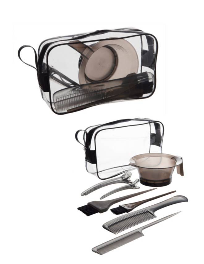 Festőszett. A csomag tartalma: Festőtál, festőecset keskeny, festőecset széles, stli fésű műanyag véggel, bontó fésű nyeles, 2 darab csipesz.