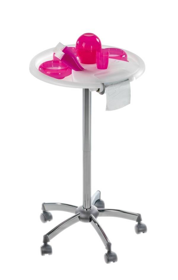 Festőkocsi. Tartozékok: 3 darab műanyag festőtál, 1 darab széles hajfestő ecset, 1 darab keskeny hajfestő ecset, 1 darab műanyag kis mérce, 1 darab műanyag shaker, 1 tekercs alumínium fólia. Műanyag felső tartórész. Fém testrész, 5 ágú fém láb, 5 darab műanyag kerékkel. 86,5cm x 40cm.